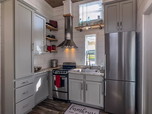 Step inside the Jackson tiny house, and you are greeted by a warm and inviting living area that serves as the heart of the home. This space is designed for relaxation and connection, perfectly embodying the principles of simple living. The open concept living design ensures the area feels bright, airy, and surprisingly expansive. Large windows flood the interior with natural light, enhancing the feeling of warmth and creating a strong connection to the outdoors. Adjacent to the living area is the kitchen, a masterpiece of efficient design. Despite the compact size, the kitchen in this custom tiny home is fully equipped for modern living. It typically features solid-surface countertops, energy efficient appliances, and ample custom cabinetry for storage. This well-appointed kitchen makes meal preparation a joy, proving that tiny house living does not require you to compromise on the functionality or quality of your culinary space. It’s the perfect setup for enjoying home-cooked meals and embracing a healthier, more intentional lifestyle.